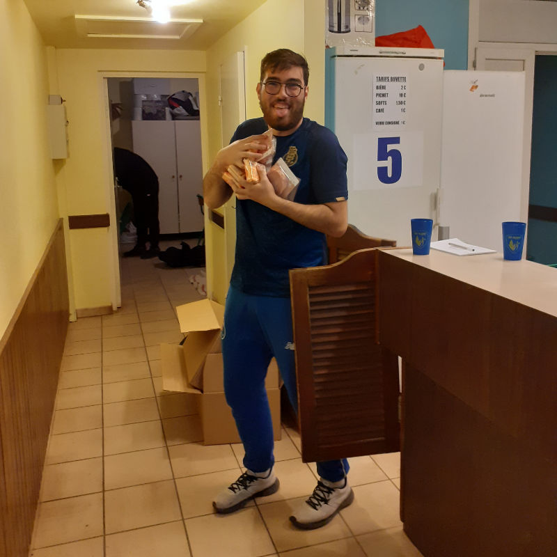 Pour accompagner le match les trois cuistots du soir (Marco, Thierry et Éric) ont proposé un excellent repas composé de burgers maison, frites et brownies. Un concours de pronostics est venu pimenter la soirée, et c’est Jules qui remporte le ballon et la gourde du club avec un beau score de 5/6 pronostics gagnants !