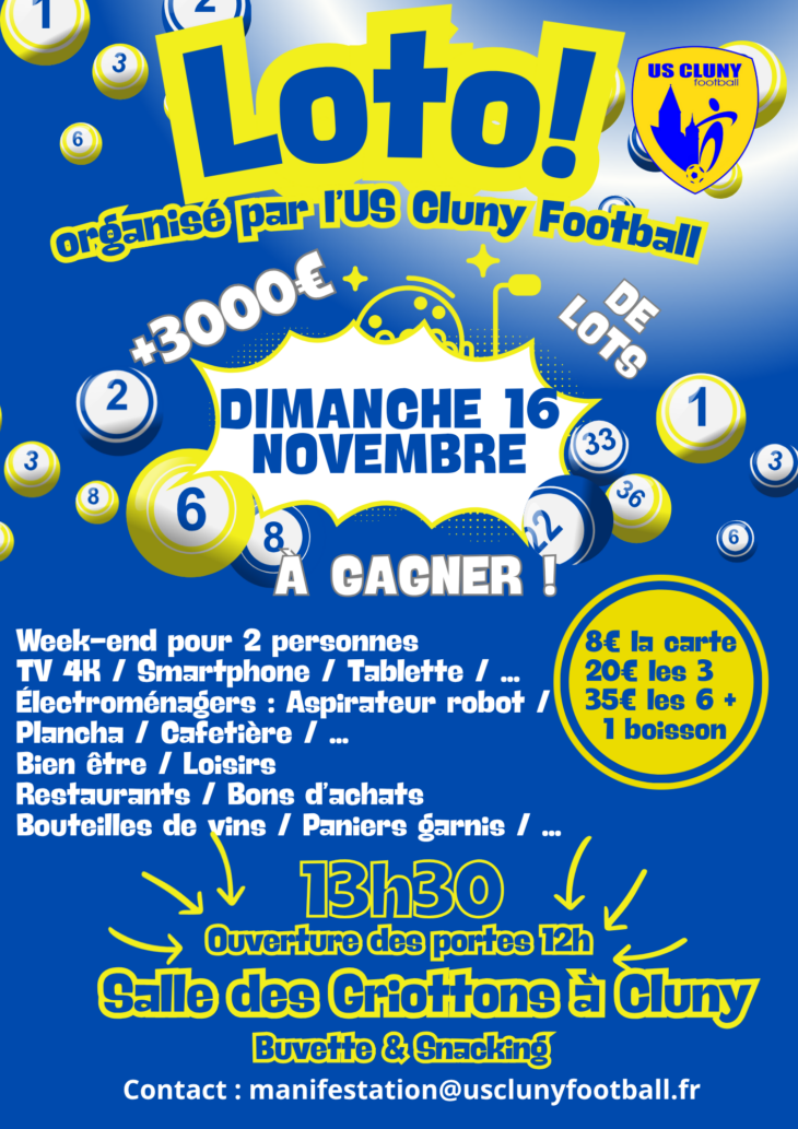 L’US Cluny Football vous invite à son loto annuel, le dimanche 16 novembre à la salle des Griottons à Cluny.